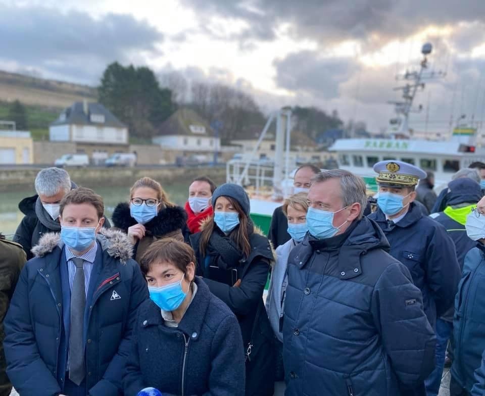 1. Janvier 2021 : aux côtés de nos pêcheurs normands à Port-en-Bessin avec la Ministre de la Mer Annick Girardin et le Secrétaire d’État aux affaires européennes, Clément Beaune et les députés Bertrand SORRE - Député de la Manche et Stéphane Travert, Député de la Manche.